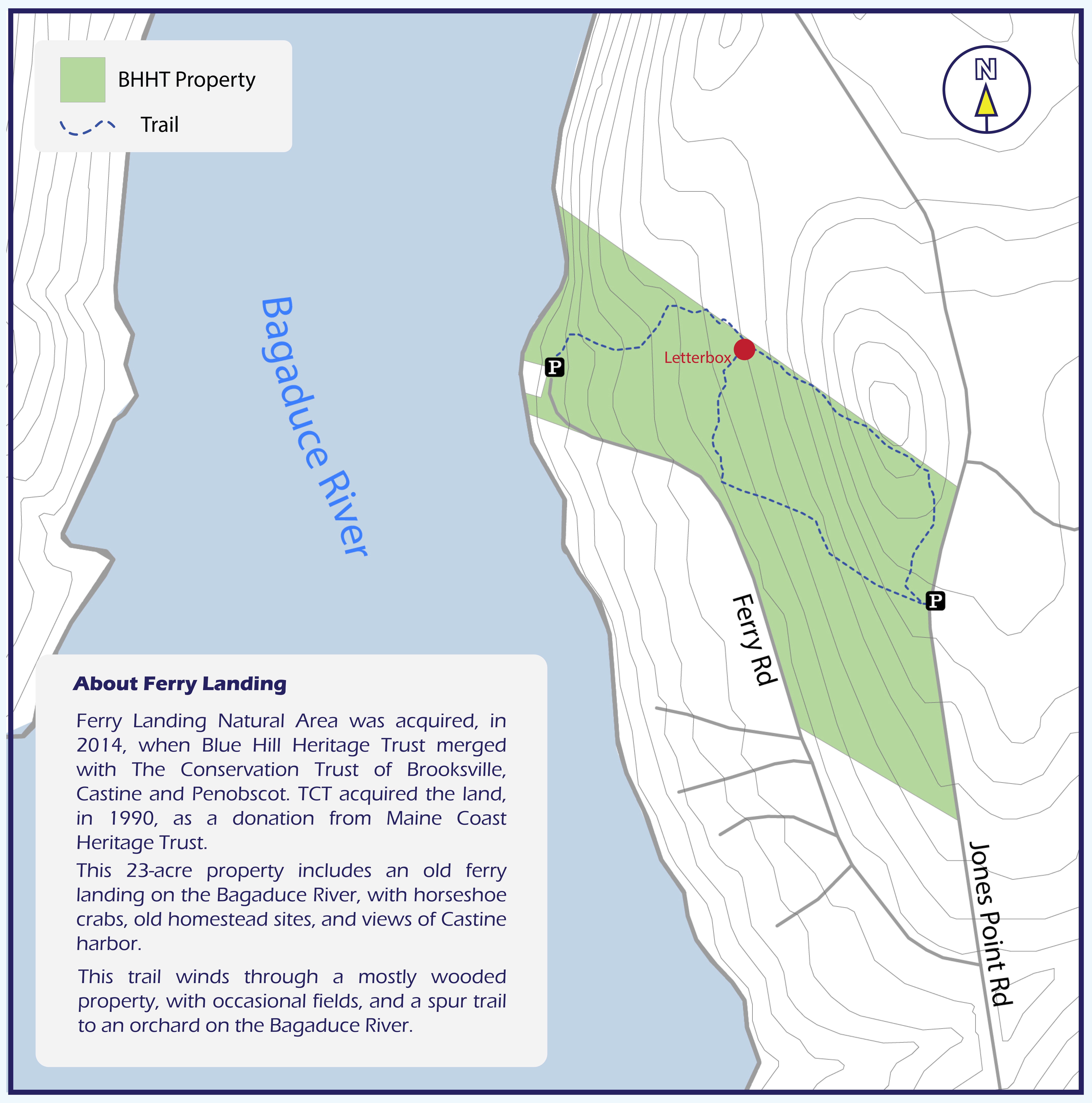 Ferry Landing Natural Area (Brooksville): Cross the Bagaduce Reversing Falls Bridge on Route 175/176. At the stop sign, take a right, following Route 176. Follow this for approximately 3 miles, until you come to the intersection that is the center of West Brooksville. Take a sharp right onto Ferry Road. After 1 mile the road splits. Take the right fork, the Jones Point Road. The Ferry Landing Natural Area parking area is on the left with a Blue Hill Heritage Trust sign. The parking area is limited to 2 vehicles.