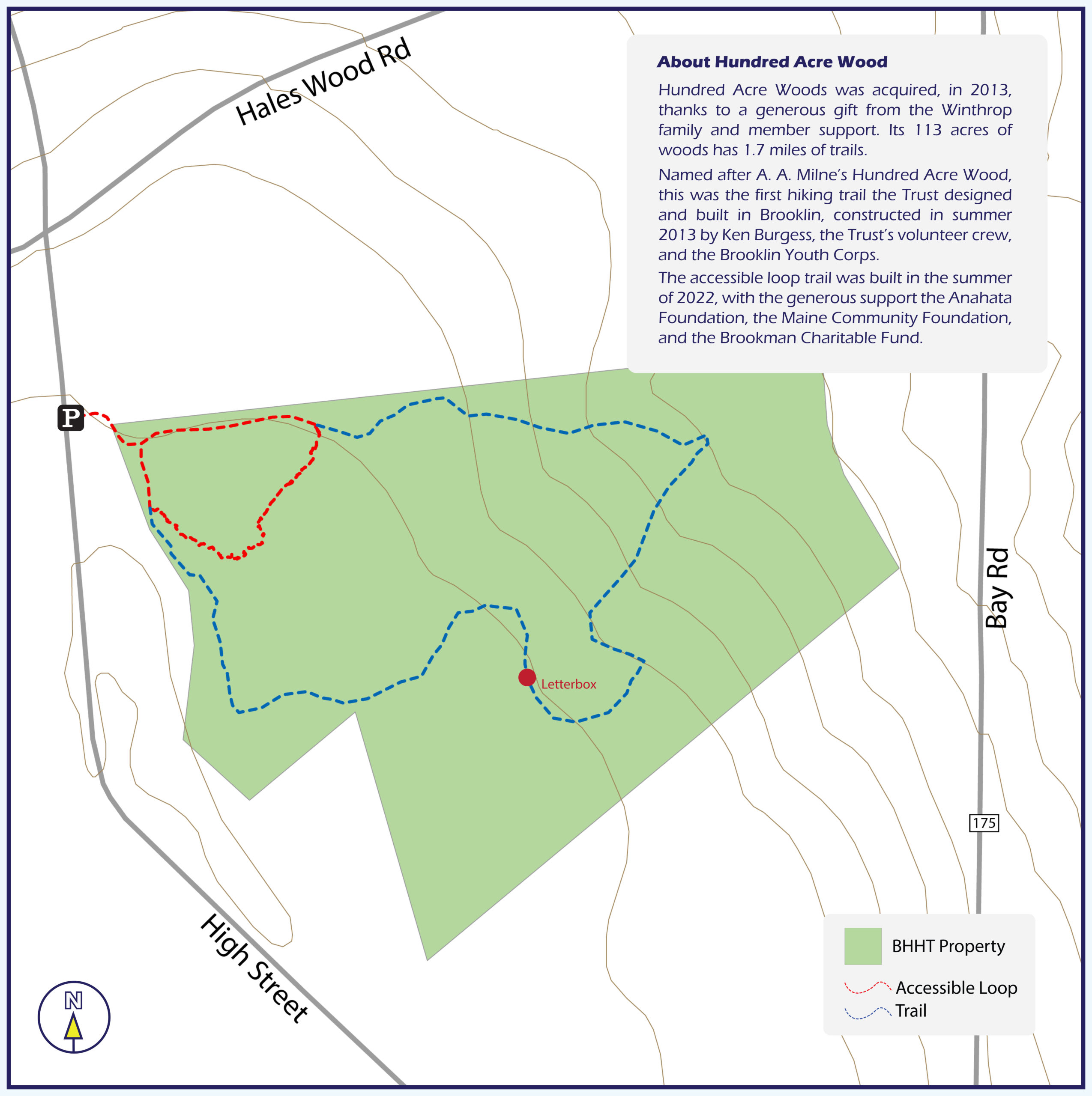 Hundred Acre Wood (Brooklin): The Hundred Acre Wood trailhead is located on High Street, 0.1 miles from the “four corners” intersection with Hales Wood Road, River Road, and Hales Hill Road.  The parking lot is able to fit four vehicles with two additional spaces designated for accessible vehicles such as those with a wheelchair ramp or lift.  This trail is available to the public because of a generous gift of land by the Stephen Winthrop and M. Jane Williamson family.
