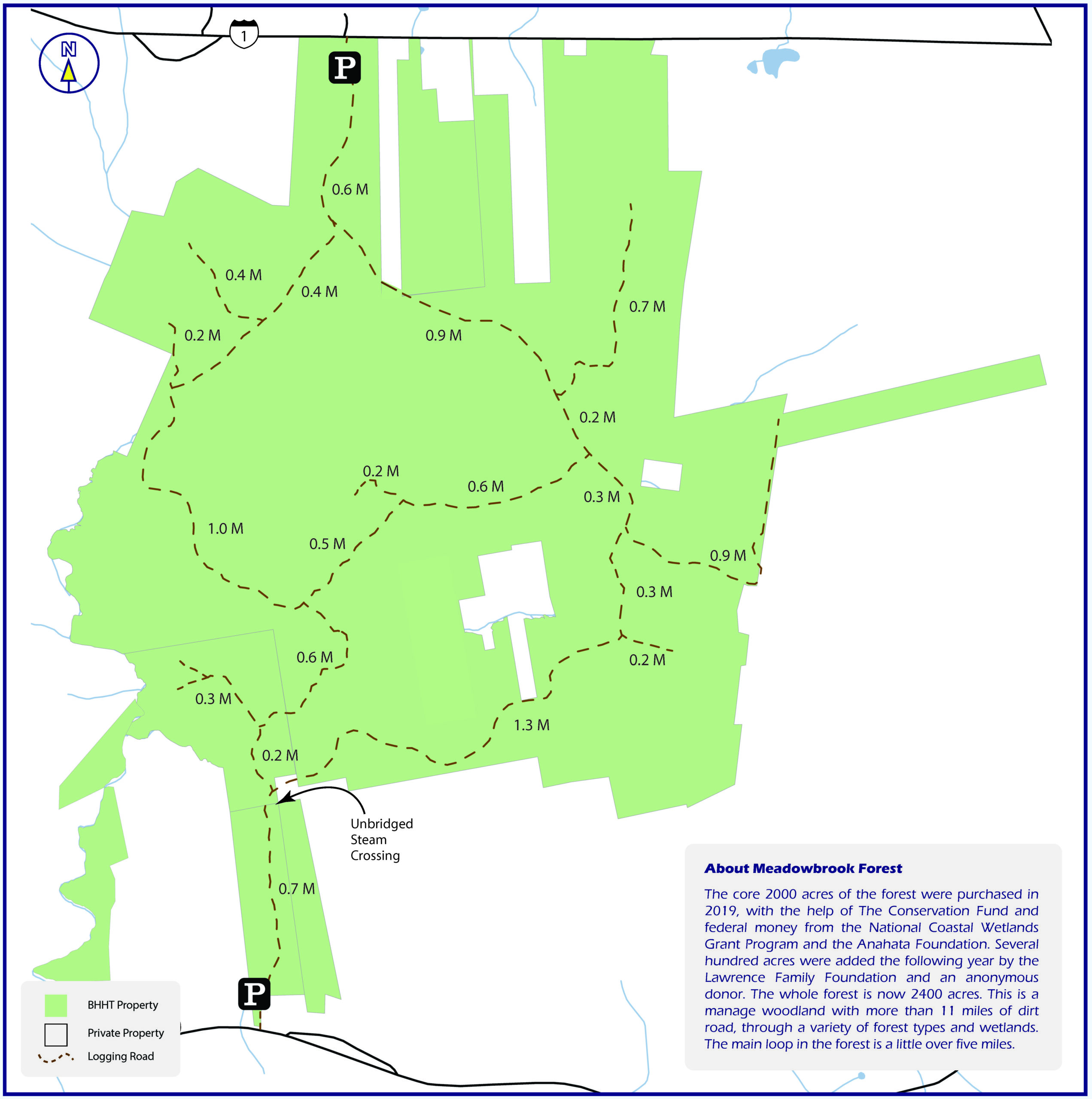Meadowbrook Forest totals over 2,030 acres and extends from Rt 172 in Surry to Rt 1 in Ellsworth! There are over 11 miles of logging roads, including a 5 mile loop, that is ideal for walking, running, or biking (some sections of the road system are bumpy and rutted). Public access is available from both Surry and Ellsworth and we have placed “you are here” maps along the trail as there are several spur roads. We hope you enjoy this gorgeous property!